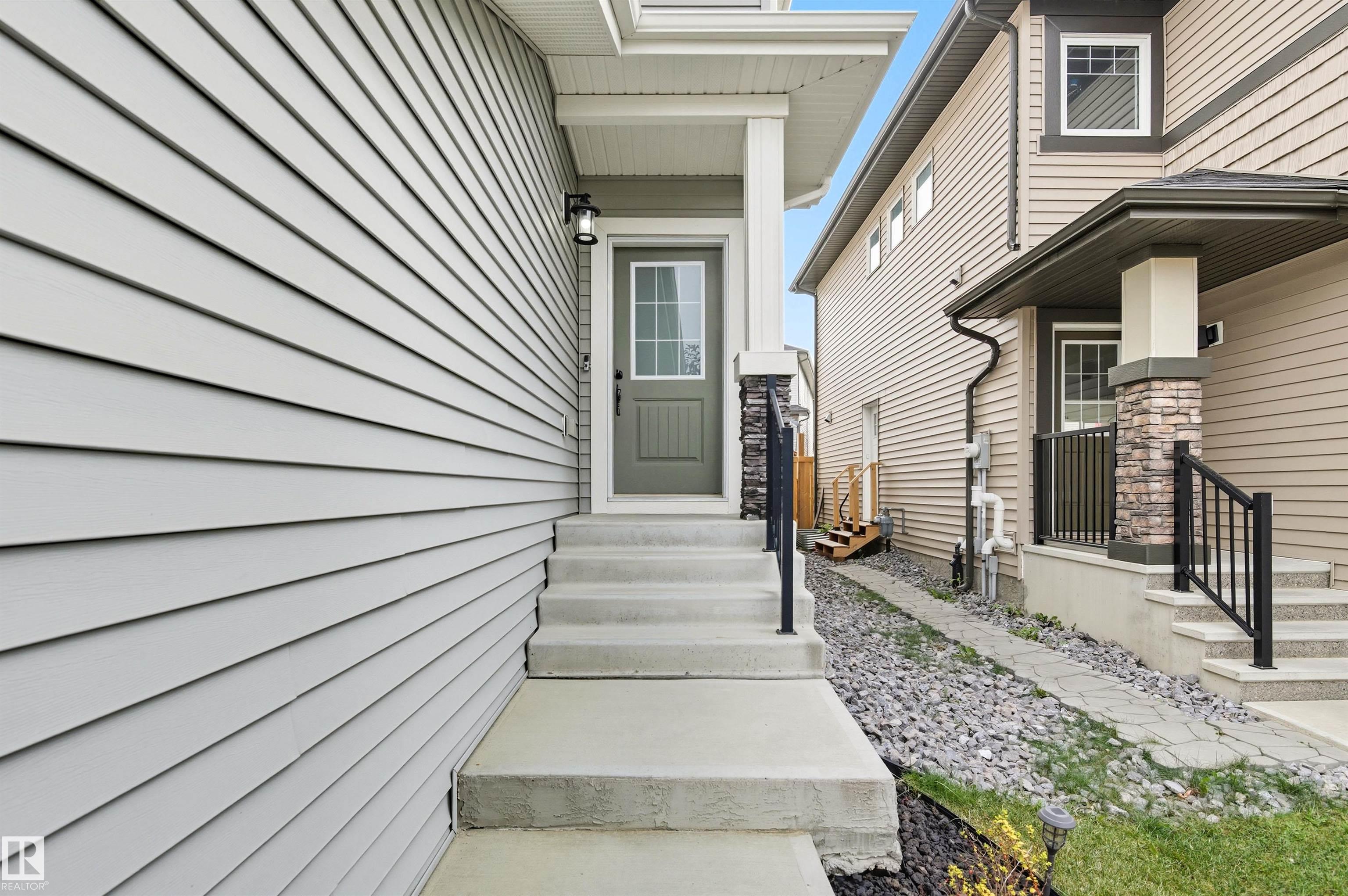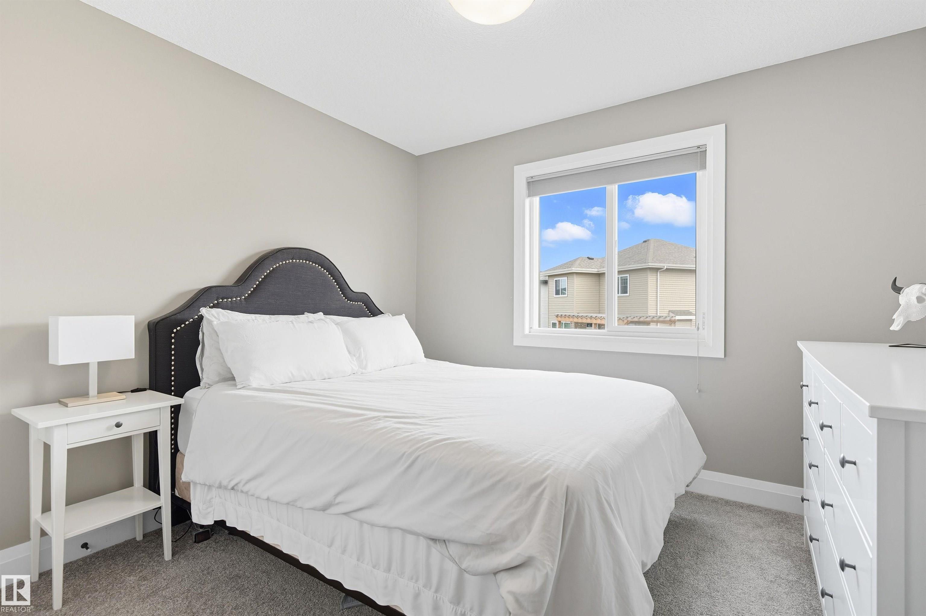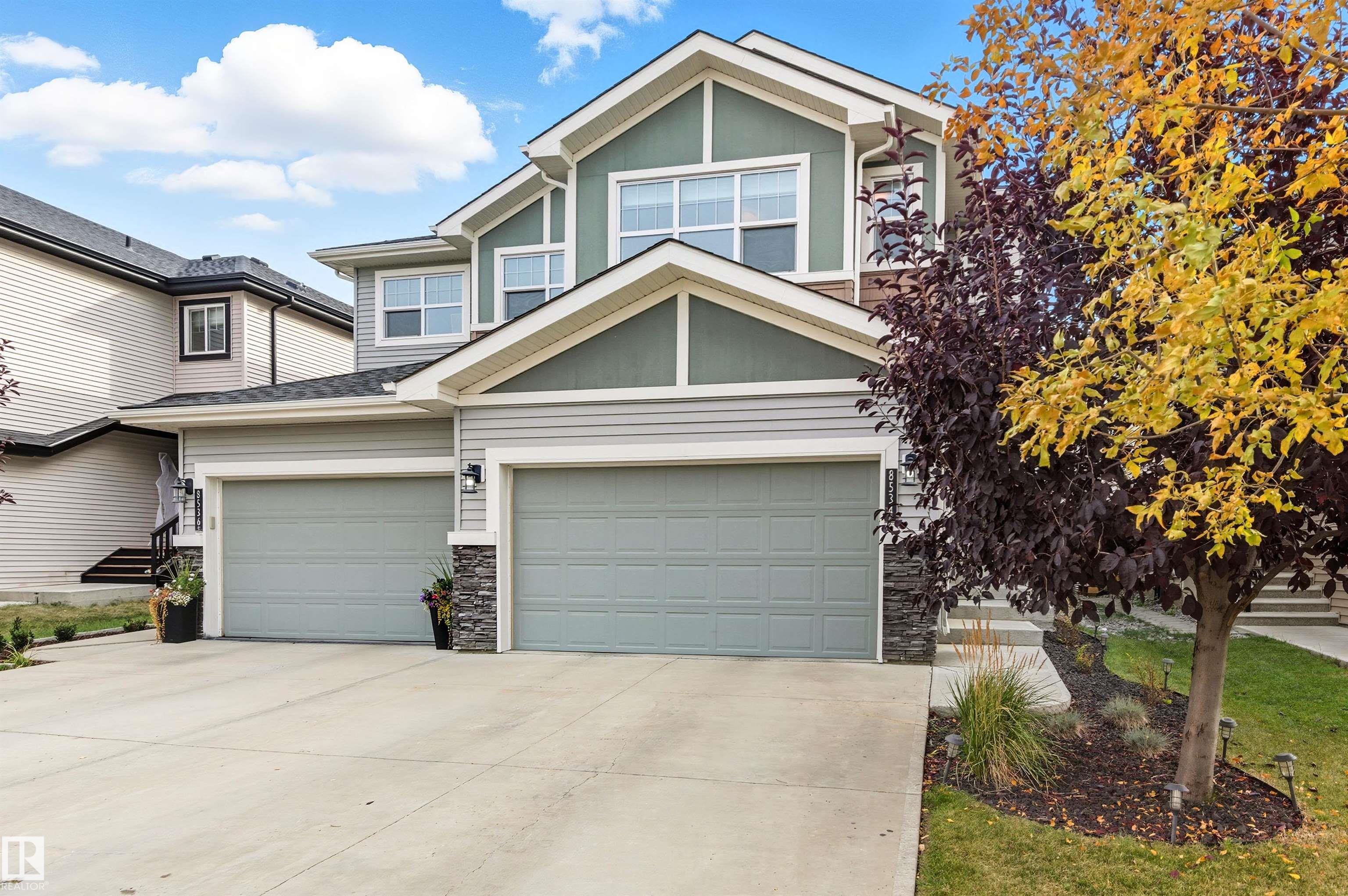 Stunning Alquinn Homes Built Half duplex with upper bonus room, massive ensuite bathroom with dual sinks, 9' ceilings, walk through butler pantry, DOUBLE ATTACHED GARAGE, and luxury upgrades throughout! Located just steps to Donald Getty School and Playground, and half a block away fro mine of south Edmonton's most elaborate community trail systems, perfect for dog walks, runs, or biking! You will love the tall ceilings, large windows, bright interior, and gorgeous features like the custom quartz countertops, upgraded stainless appliances, beautiful white ceiling height cabinetry, upgraded pendant lighting over the kitchen island, the walkthrough butlers pantry with coffee bar, and built in bench / coat hook in the mudroom! The upper layout is amazing with central bonus room, two large bedrooms, upper laundry room, and the 3rd bedroom being the primary suite with walk in closet and huge 5 piece ensuite! With a huge yard, rear deck, and high end window coverings, this lovingly maintained home is a prize!
