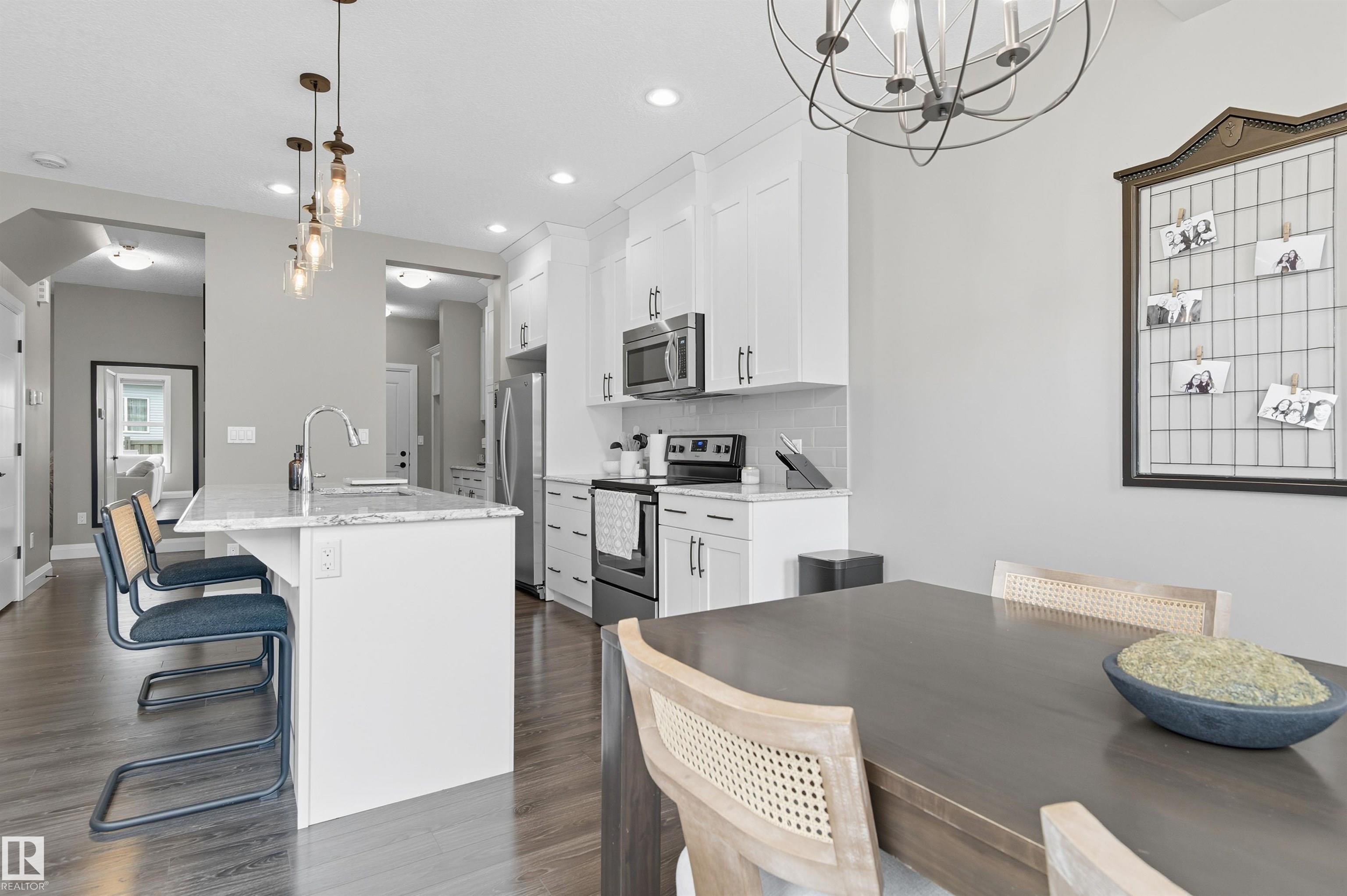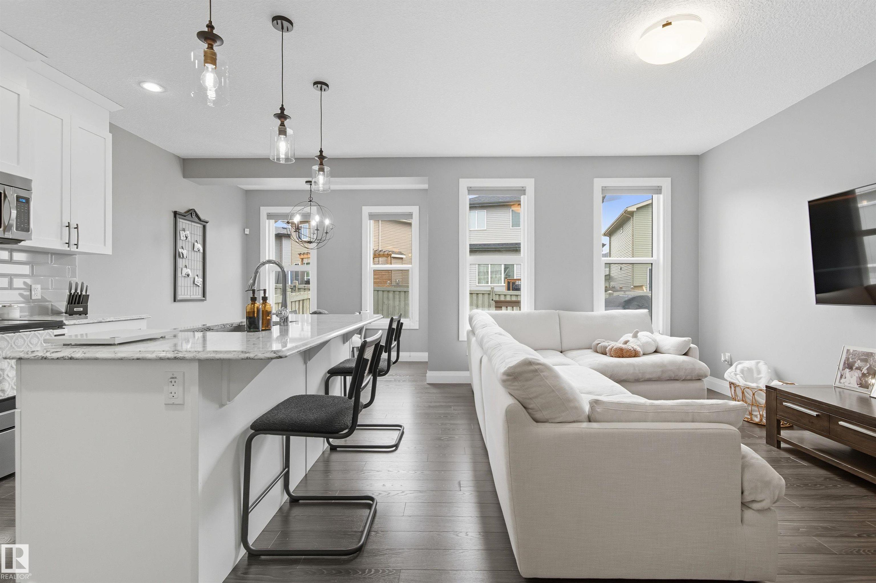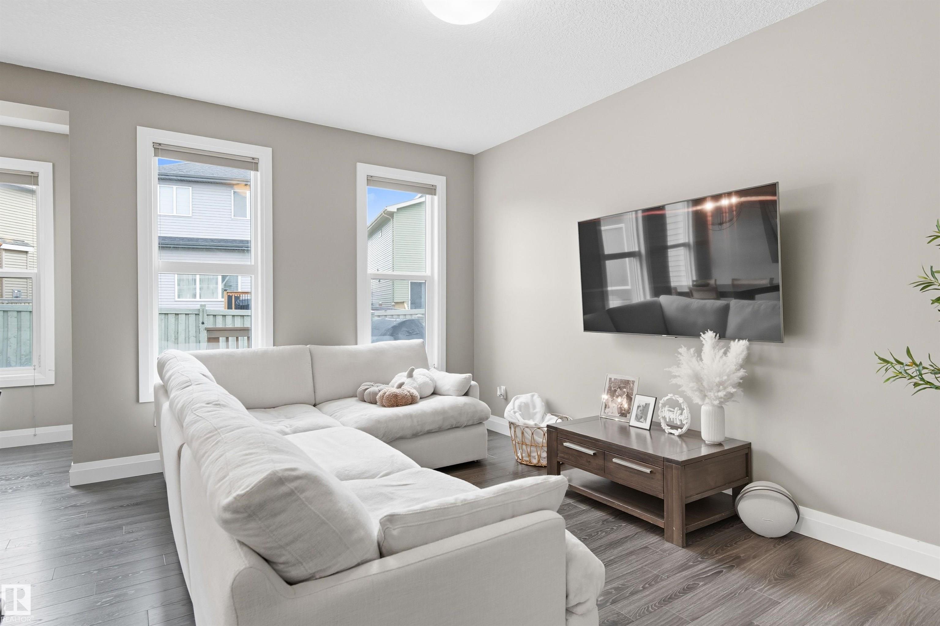 Stunning Alquinn Homes Built Half duplex with upper bonus room, massive ensuite bathroom with dual sinks, 9' ceilings, walk through butler pantry, DOUBLE ATTACHED GARAGE, and luxury upgrades throughout! Located just steps to Donald Getty School and Playground, and half a block away fro mine of south Edmonton's most elaborate community trail systems, perfect for dog walks, runs, or biking! You will love the tall ceilings, large windows, bright interior, and gorgeous features like the custom quartz countertops, upgraded stainless appliances, beautiful white ceiling height cabinetry, upgraded pendant lighting over the kitchen island, the walkthrough butlers pantry with coffee bar, and built in bench / coat hook in the mudroom! The upper layout is amazing with central bonus room, two large bedrooms, upper laundry room, and the 3rd bedroom being the primary suite with walk in closet and huge 5 piece ensuite! With a huge yard, rear deck, and high end window coverings, this lovingly maintained home is a prize!