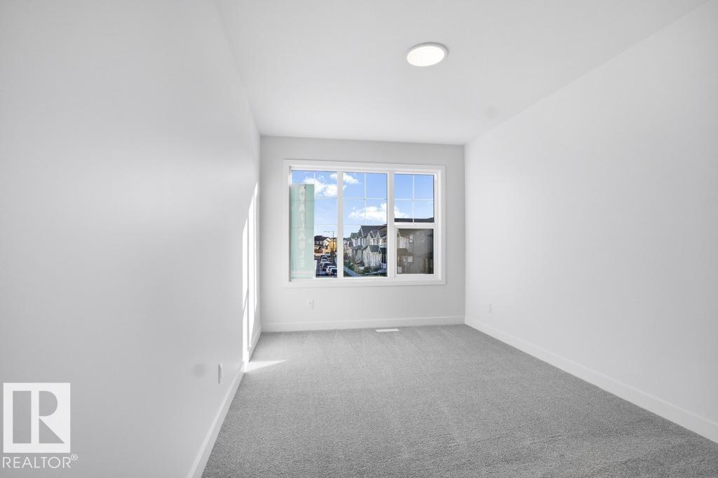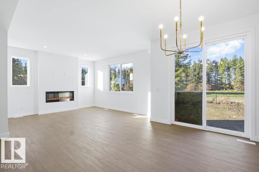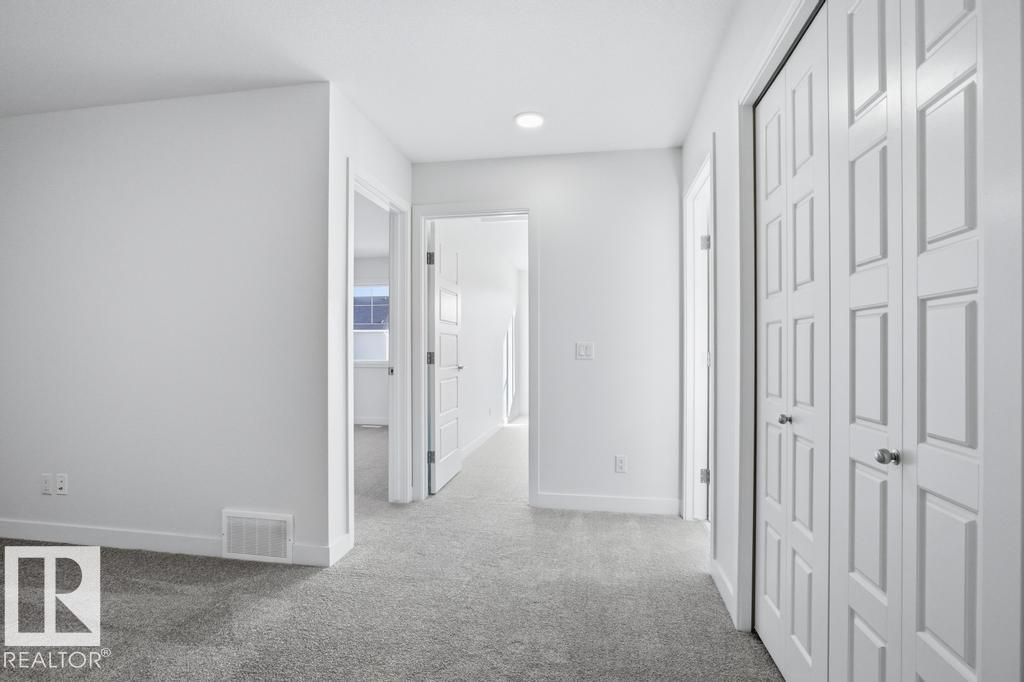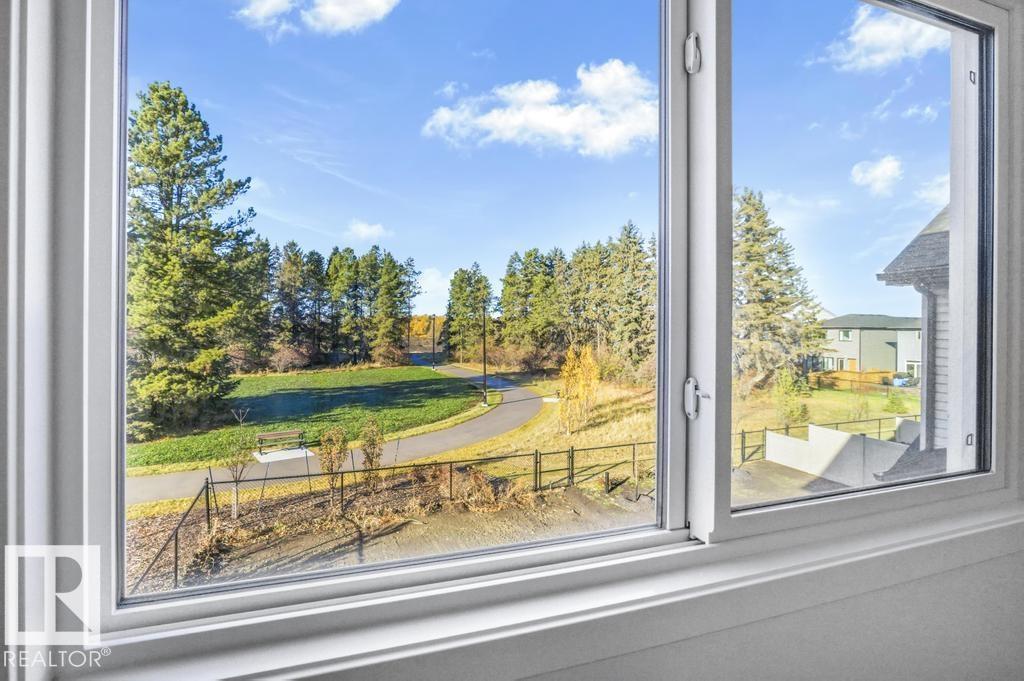 Our popular Rundle model is perfectly situated on a corner lot backing onto Frieda Hiller Park, offering a picturesque setting with mature trees, walking trails, and generous green space. Enjoy a west-facing backyard with chain-link fencing along the side and rear, providing an unobstructed park view right from your home. Inside, the bright living room features additional windows for extra natural light and a modern electric fireplace. An enclosed side entrance offers convenience and excellent potential for future basement development. The designer kitchen showcases upgraded maple cabinetry with gold hardware, 3CM white quartz countertops, an undermount Silgranit sink, and elegant gold pendant lighting above the island. Included appliances are a French-door refrigerator with internal water and ice, dishwasher, electric range, built-in microwave, and a chimney-style hood fan. Up the stairs, iron spindle railings replace the standard stub wall for a stylish open feel.