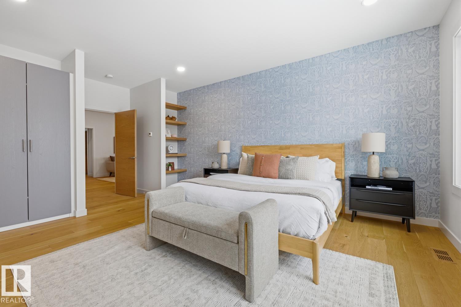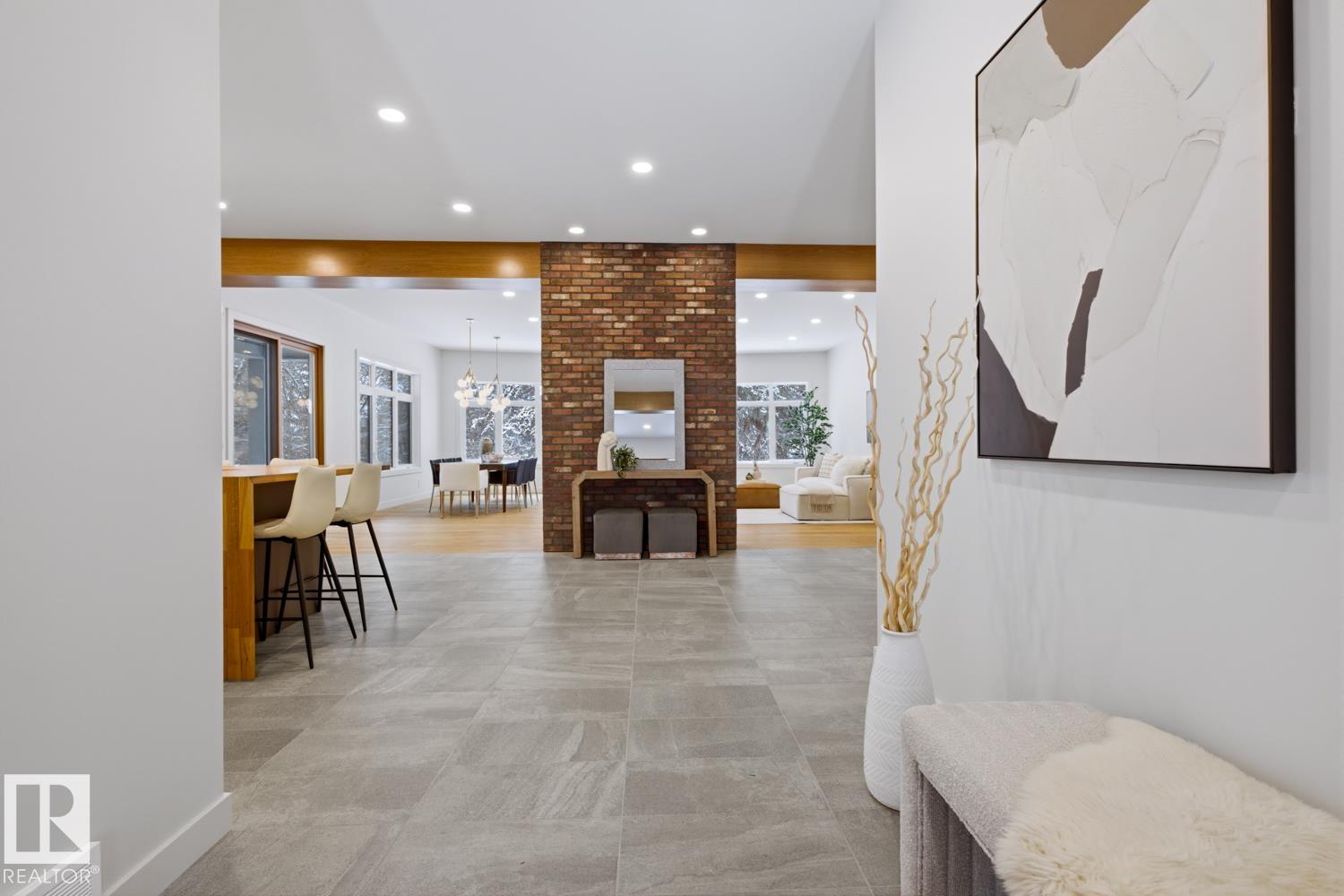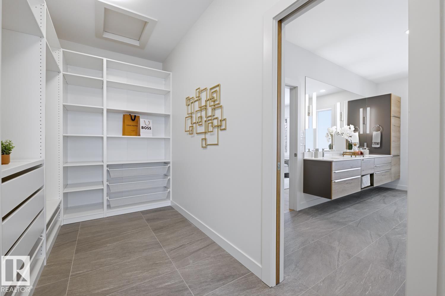 Prestigious GRANDVIEW a rare NEW with over 5,790 sqft living space, custom contemporary infill steps from UofA, minutes from the newly announced Stollery Children's Hospital, elevating this already prime location. This 5-bed, 6-bath masterpiece features an open layout, chef's kitchen, Dekton counters, high-end appliances, a butler's pantry. Main floor showcases white-oak hardwood, designer fireplace, office/den, stylish bath, and a large gear/storage room. Sliders open to a covered, heated deck overlooking the treed ravine. Upper level offers a luxury primary suite, plus two bedrooms each with their own ensuite and in-floor heating, laundry room, and a bonus area with doors to a covered, heated balcony engineered for a future hot tub. Fully finished basement includes cold room, 2 large bedrooms, 2 full baths, spacious rec room, and in-floor heating. Home features 2 furnaces (4 zones), AC, central vac, humidifier, and an oversized heated garage. Situated on a landscaped, park-like lot with mature trees.