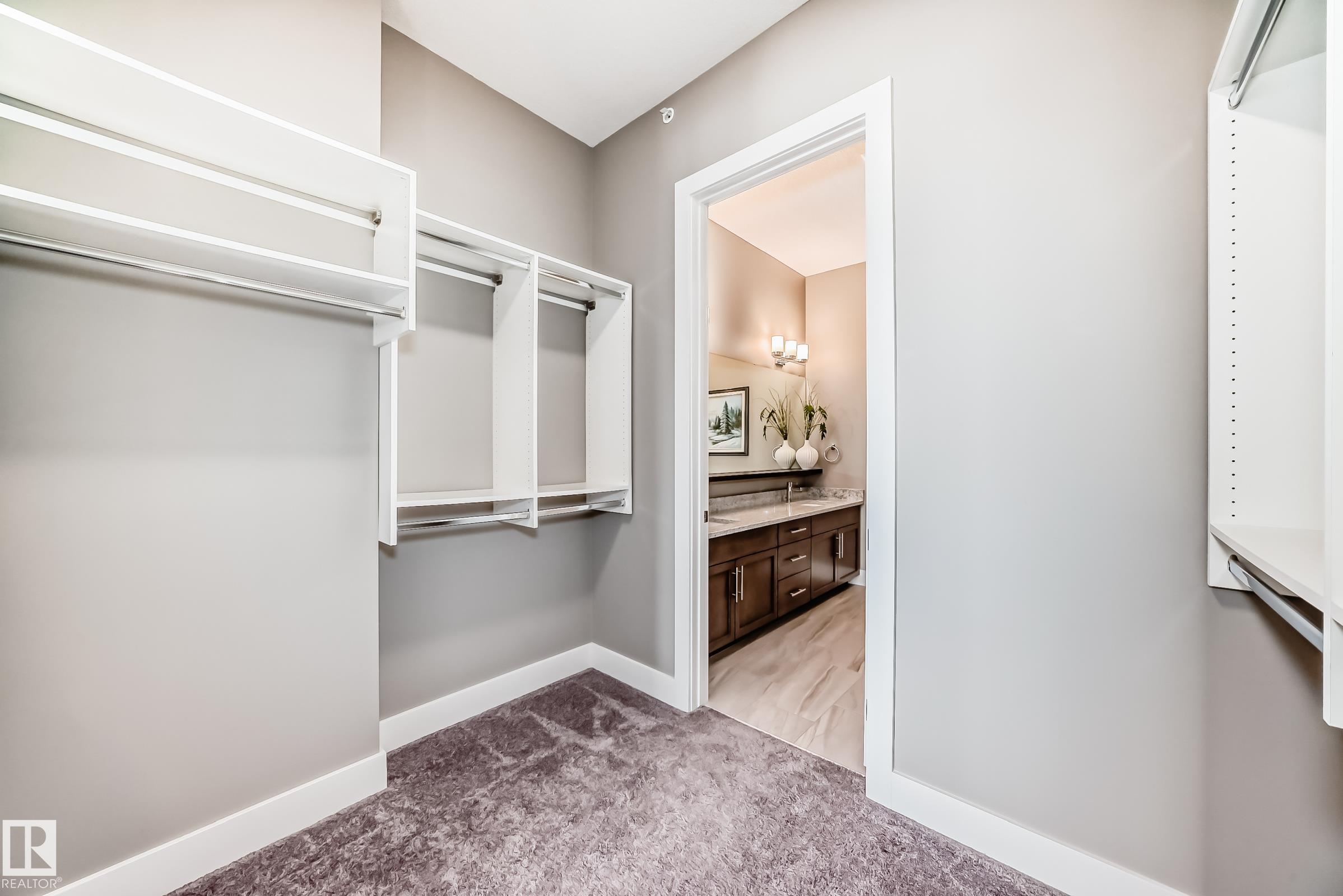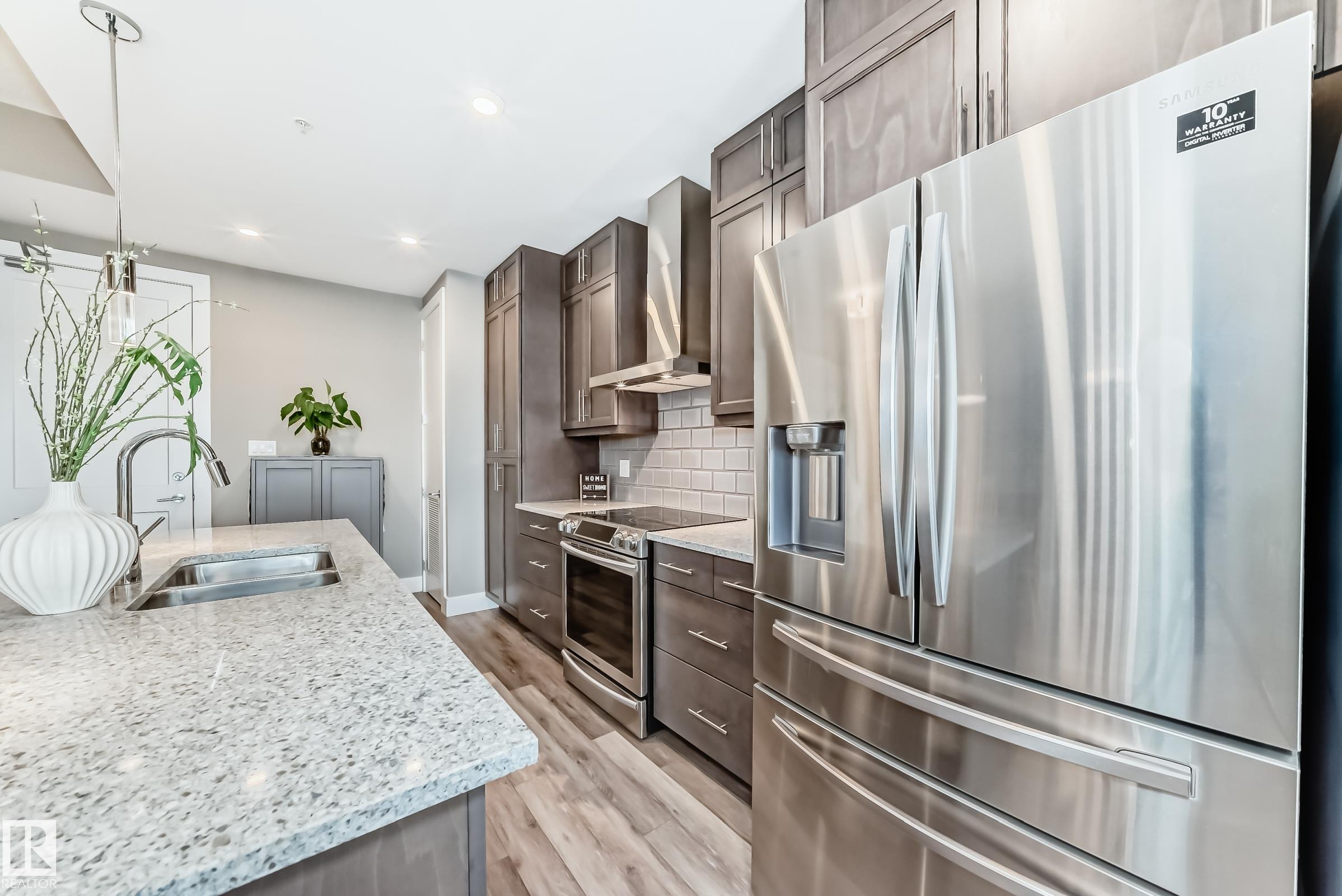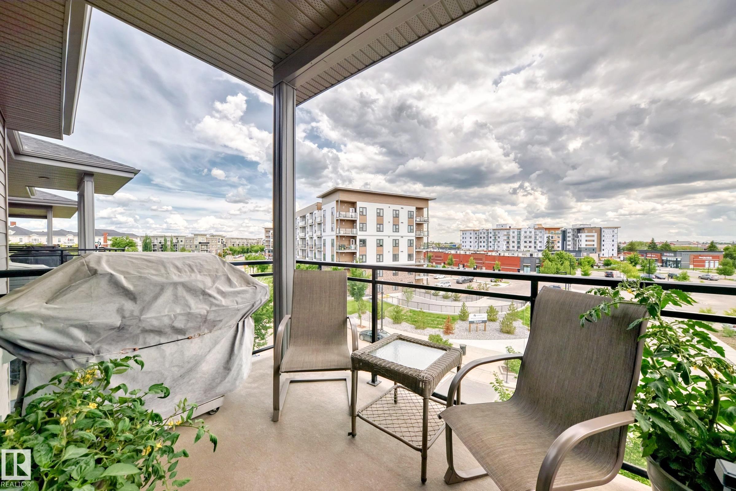 Welcome to this Superior Curb Appeal top floor, 2 bedrooms, 2 bathrooms condo offers Unparalleled Value and Build Quality, situated in the desirable Griesbach community! only steps to Lakes, Park, Playground, Walking-trail, K-9 School, Shopping, shops, restaurants, Northgate ETS, etc... Features open concept, large & bright 10 ft ceiling living room with luxury vinyl plank floorings throughout enhance the sophistication & elevate the allure of this home! Great balcony offers beautify downtown view & perfect for summer BBQ! Spacious kitchen boasts SS appliances, large kitchen island, quartz countertops & an abundance of cabinets. 2 sizable bedrooms & a 4 piece bathroom. King-sized master bedroom c/w a 4pc en-suite & walk-through closet. An in-suite laundry with high-end front load washer & dryer. Title heated underground parking stall with a storage cage. Building amenities including fitness room, guest suite & social room. Shows 10/10! Quick possession available. Just move-in & ENJOY!