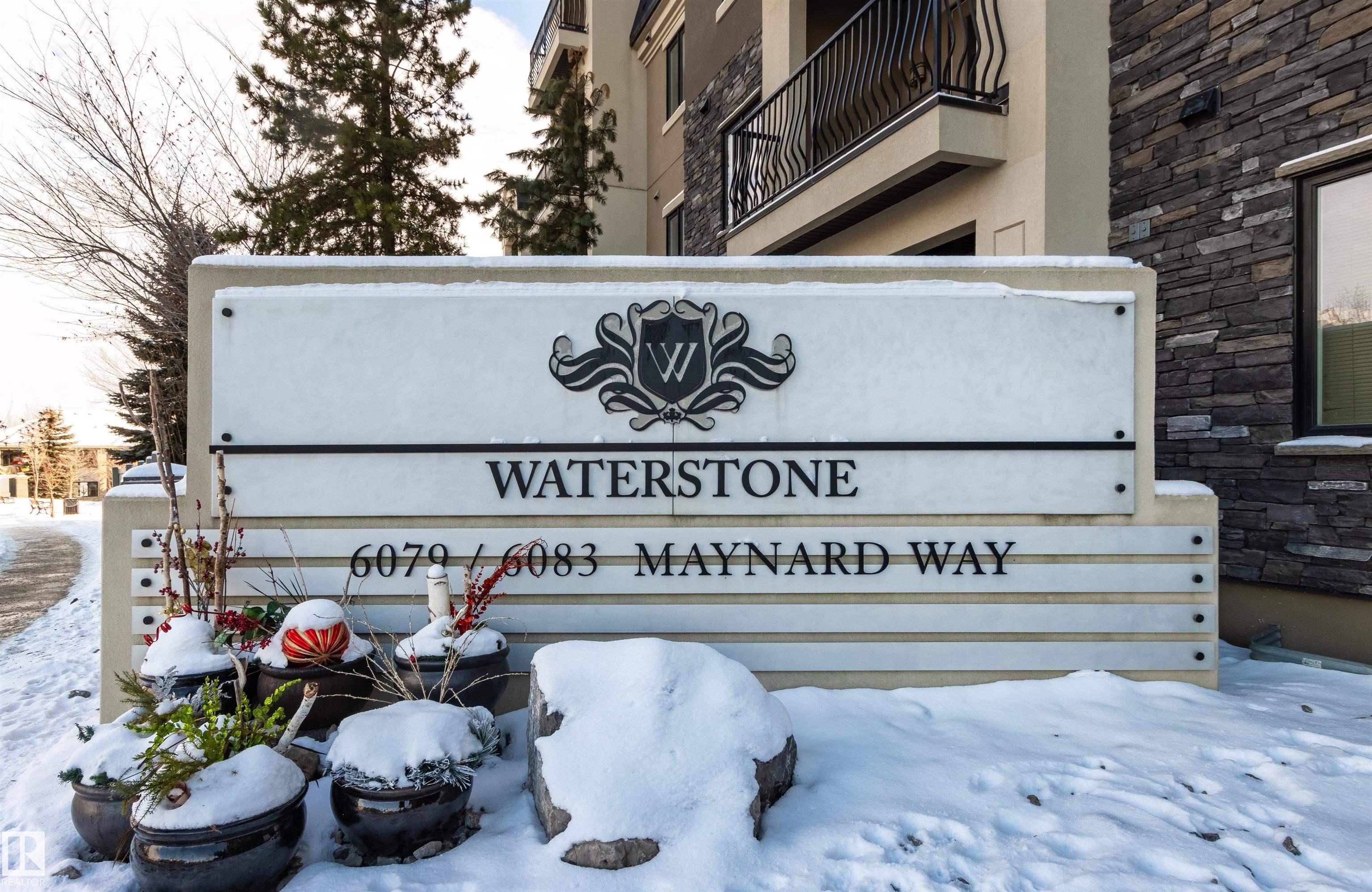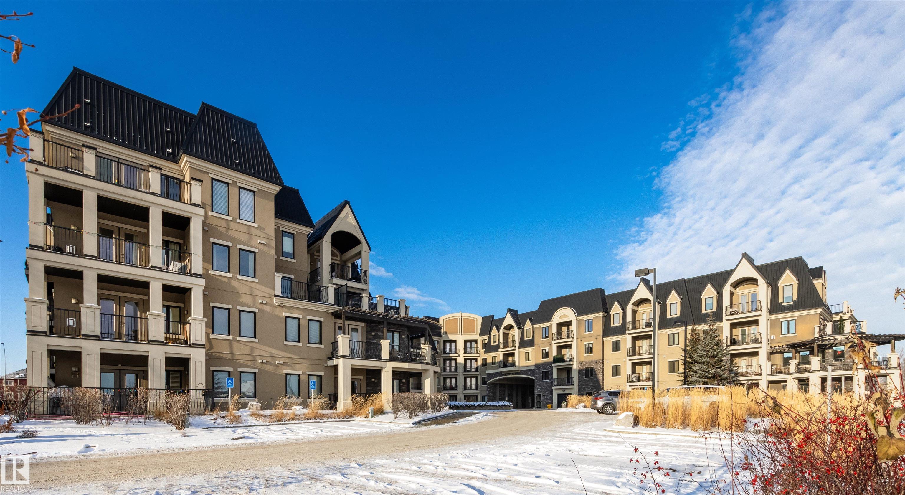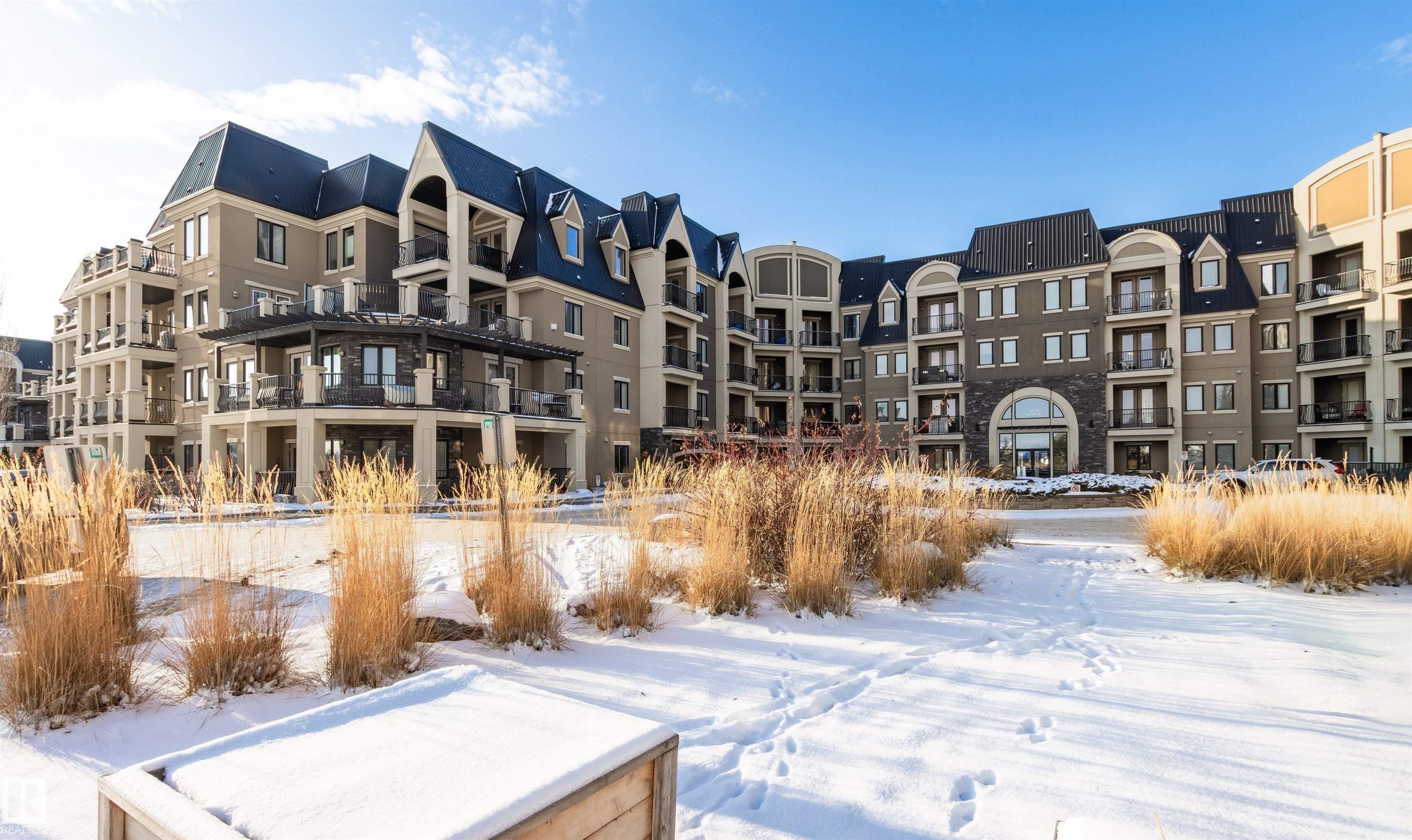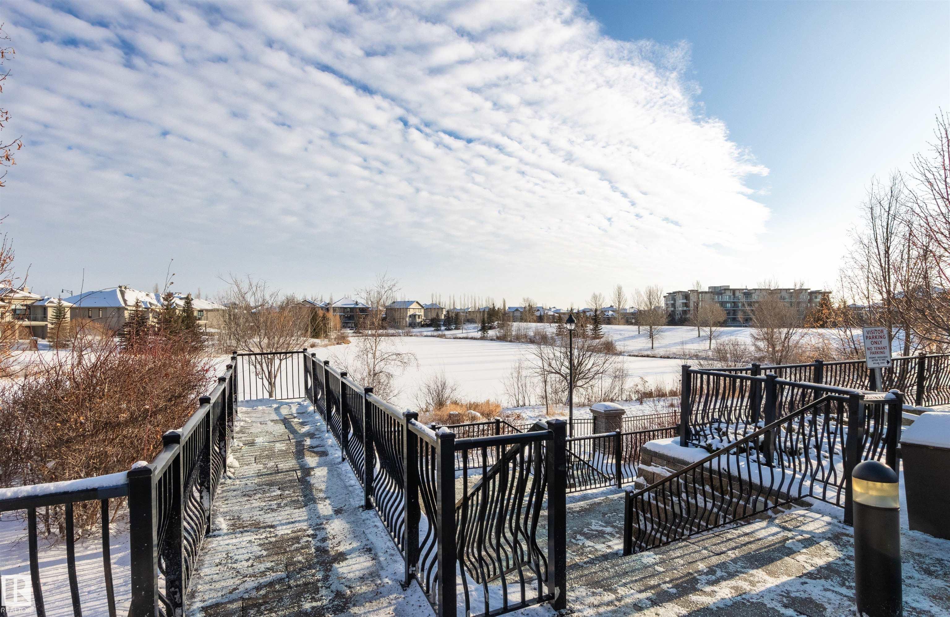 Rare opportunity to own this penthouse corner end unit with spectacular views off the balcony overlooking 2 lakes, landscaped trees, & walking trails! This 2 bedroom + den "open" concept layout features; chefs galley kitchen, cherry stained mahogany cabinets, granite counter tops, s/s appliances, impressive 10' vaulted ceilings, engineered hickory hardwood, custom built-in murphy bed, den has built-in book shelf unit, ensuite off primary bed. has huge shower w/his & hers closets, in-suite laundry, spacious living rm w/corner mantle fireplace, formal dining rm., patio drs. lead to one of two covered private decks. A truly remarkable gem in Mactaggarts exclusive neighborhood. Best of all its an original owner & yes in showhome condition! Complete with two heated underground stalls, one storage cage, two gyms, social rms., & Guest Suites! Just minutes to Windemere, South Edmonton Common & Anthony Henday.