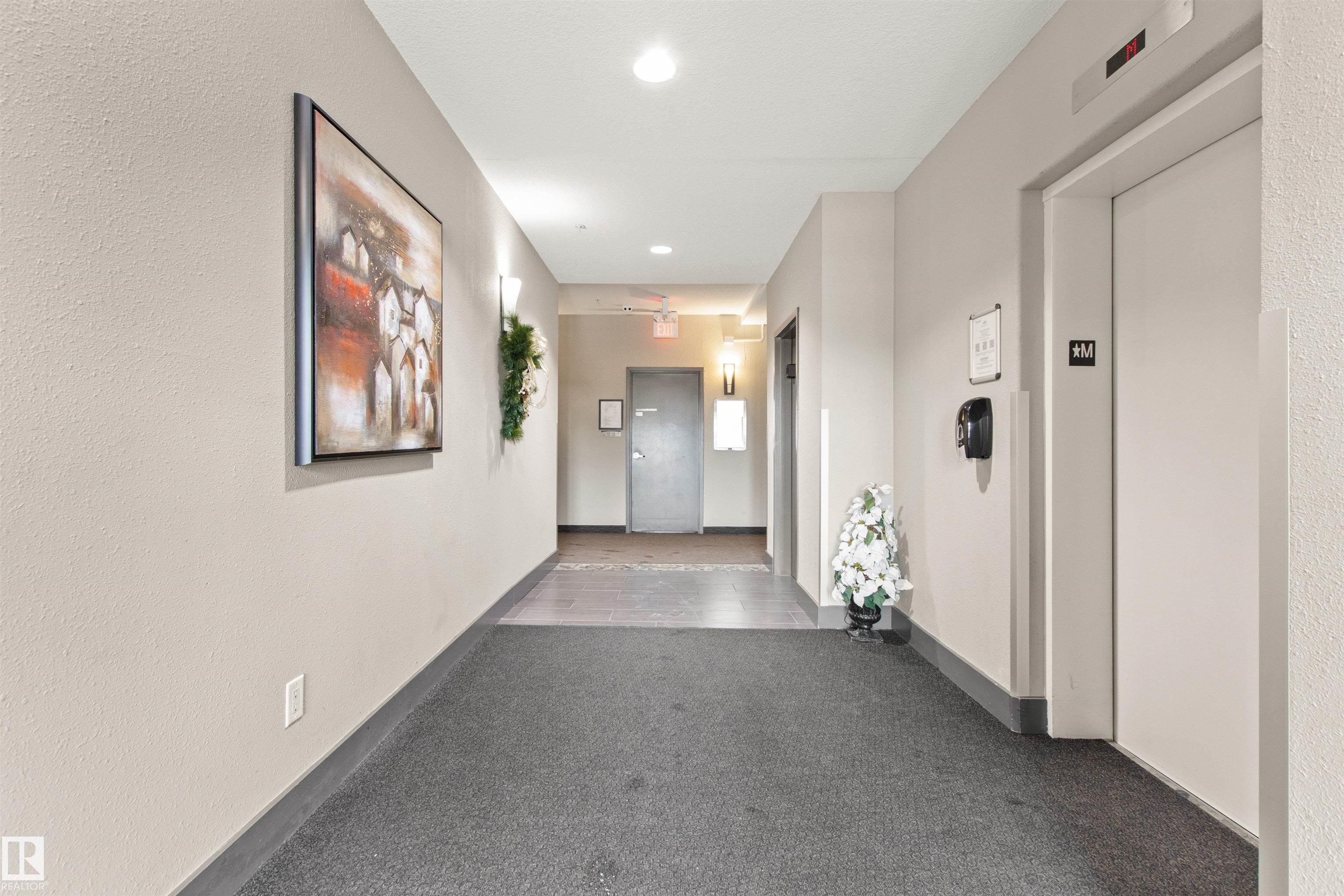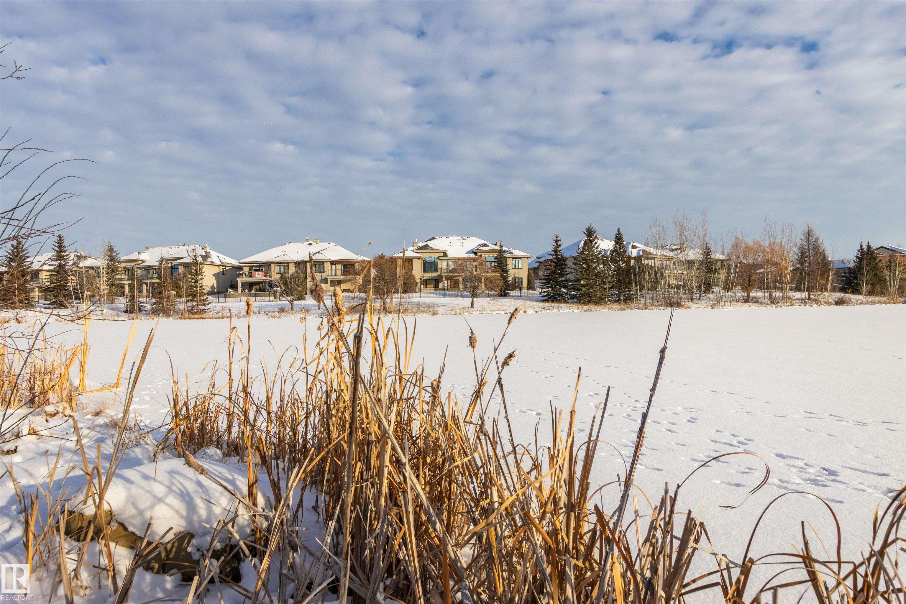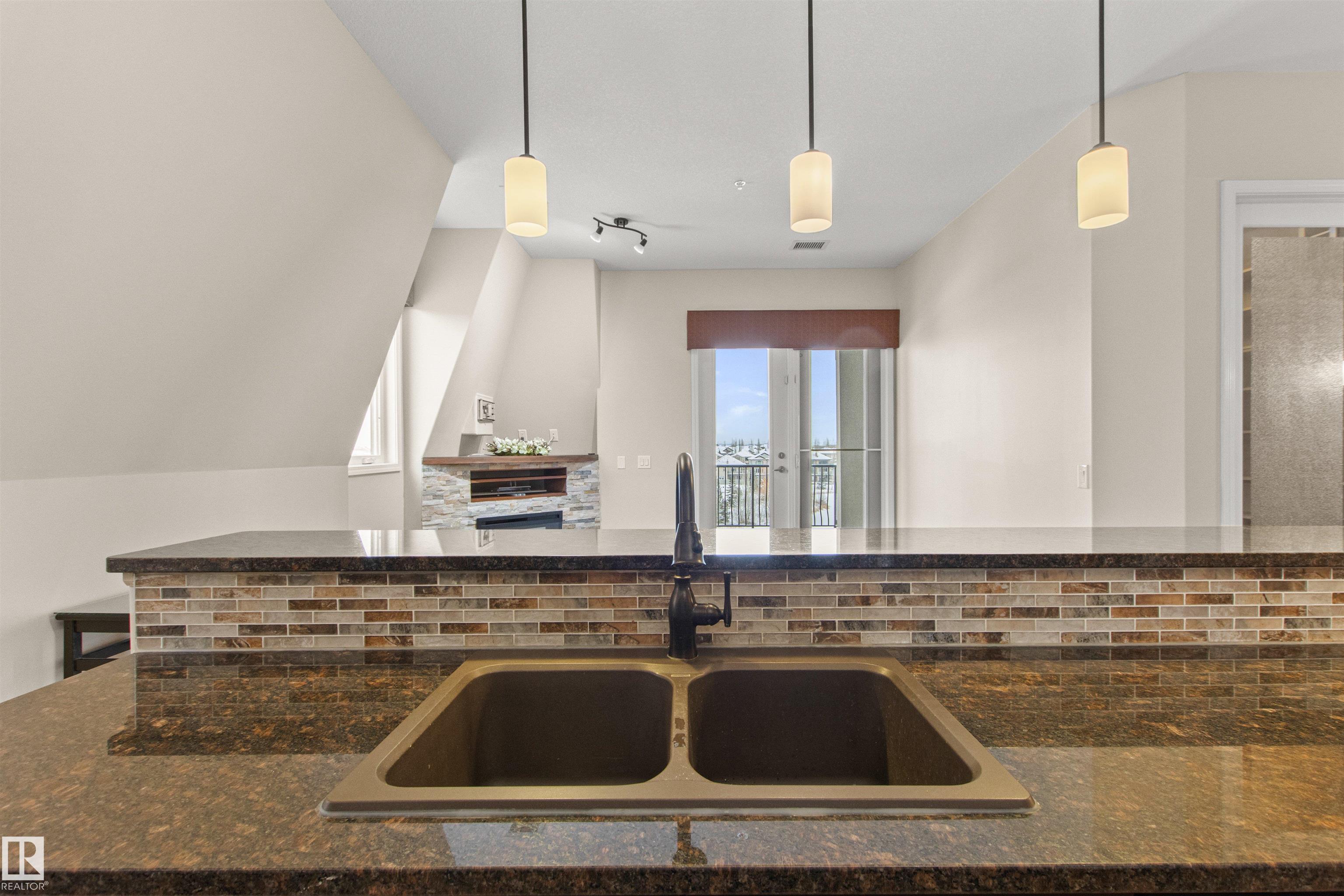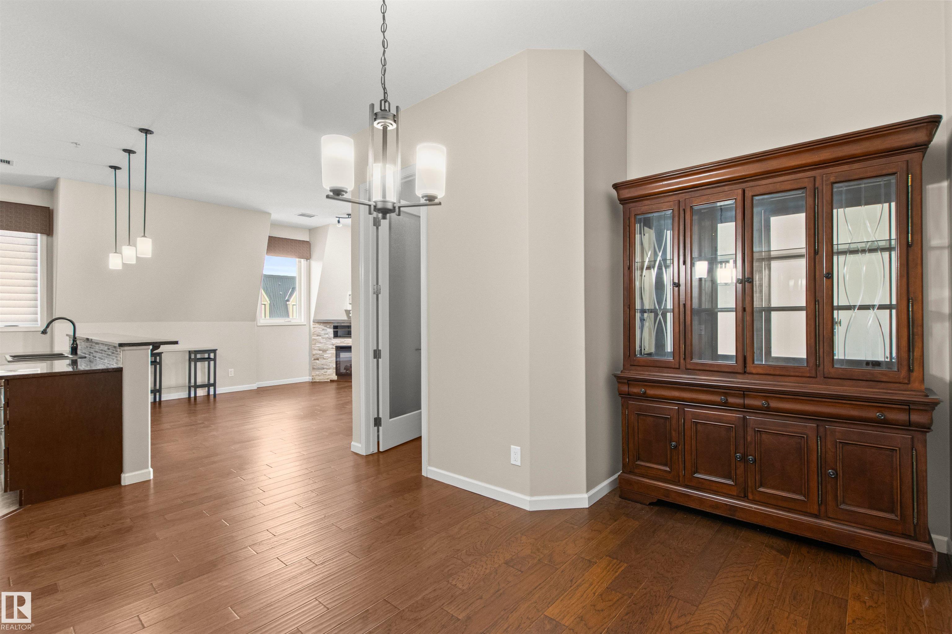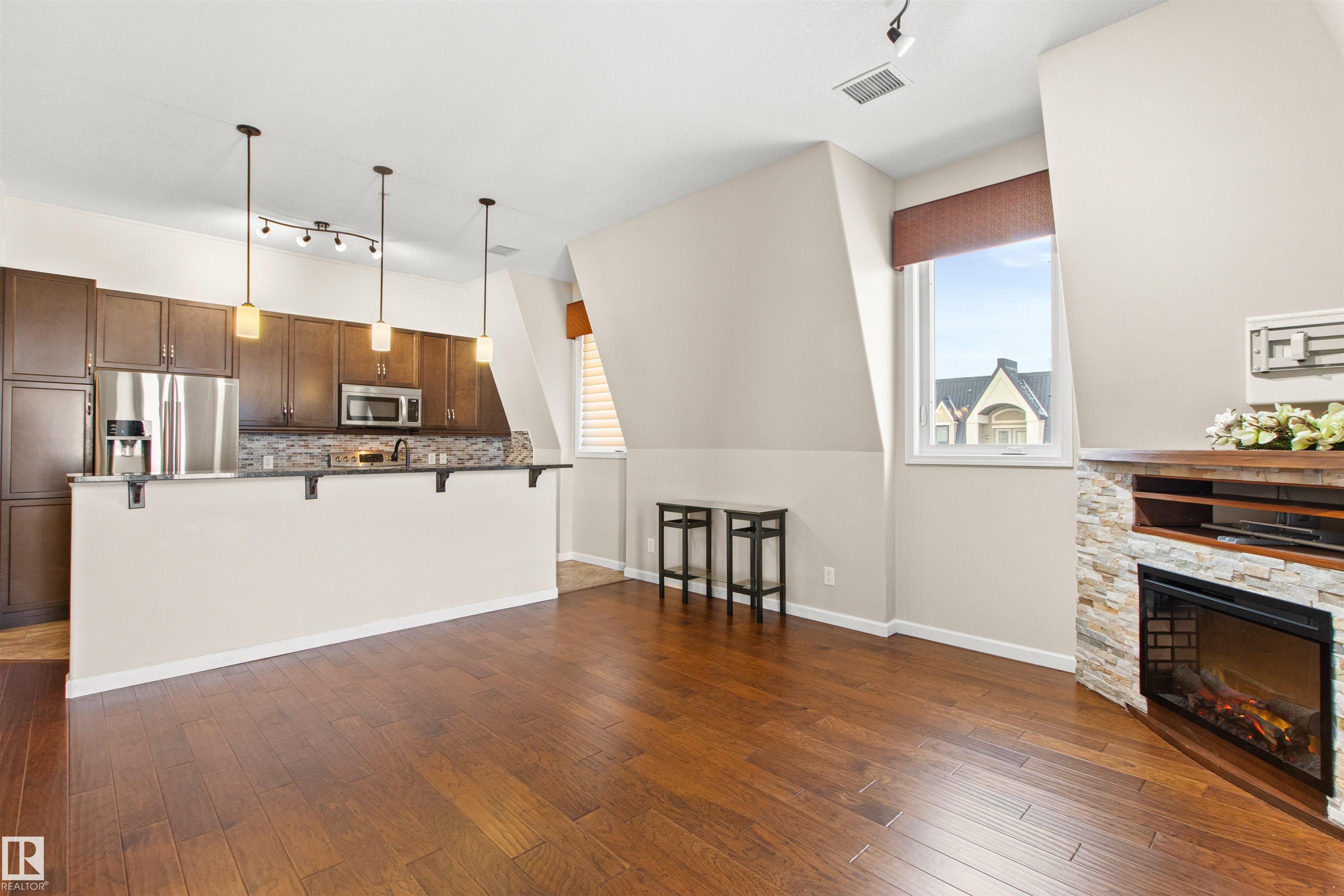 Rare opportunity to own this penthouse corner end unit with spectacular views off the balcony overlooking 2 lakes, landscaped trees, & walking trails! This 2 bedroom + den "open" concept layout features; chefs galley kitchen, cherry stained mahogany cabinets, granite counter tops, s/s appliances, impressive 10' vaulted ceilings, engineered hickory hardwood, custom built-in murphy bed, den has built-in book shelf unit, ensuite off primary bed. has huge shower w/his & hers closets, in-suite laundry, spacious living rm w/corner mantle fireplace, formal dining rm., patio drs. lead to one of two covered private decks. A truly remarkable gem in Mactaggarts exclusive neighborhood. Best of all its an original owner & yes in showhome condition! Complete with two heated underground stalls, one storage cage, two gyms, social rms., & Guest Suites! Just minutes to Windemere, South Edmonton Common & Anthony Henday.