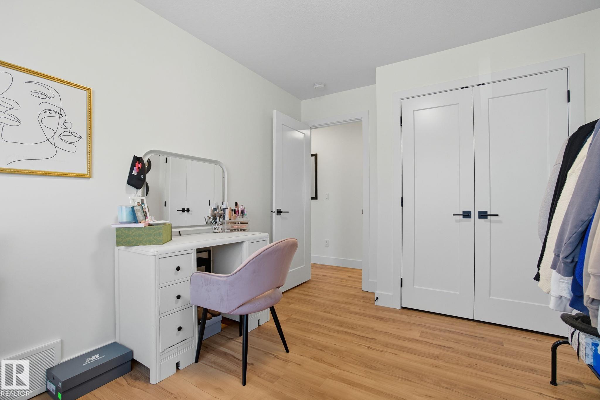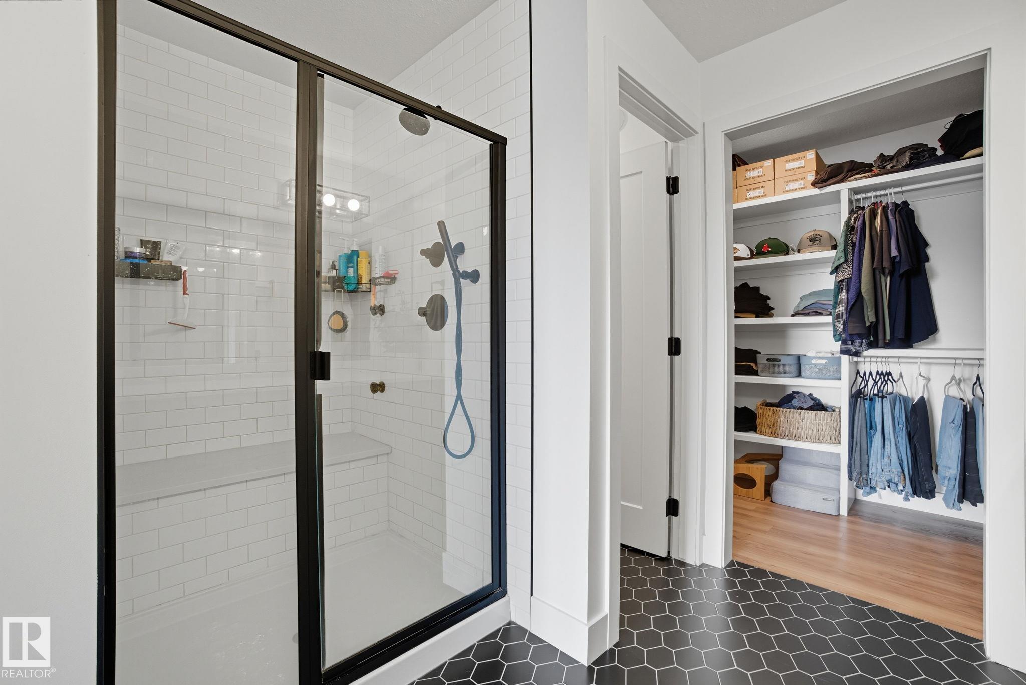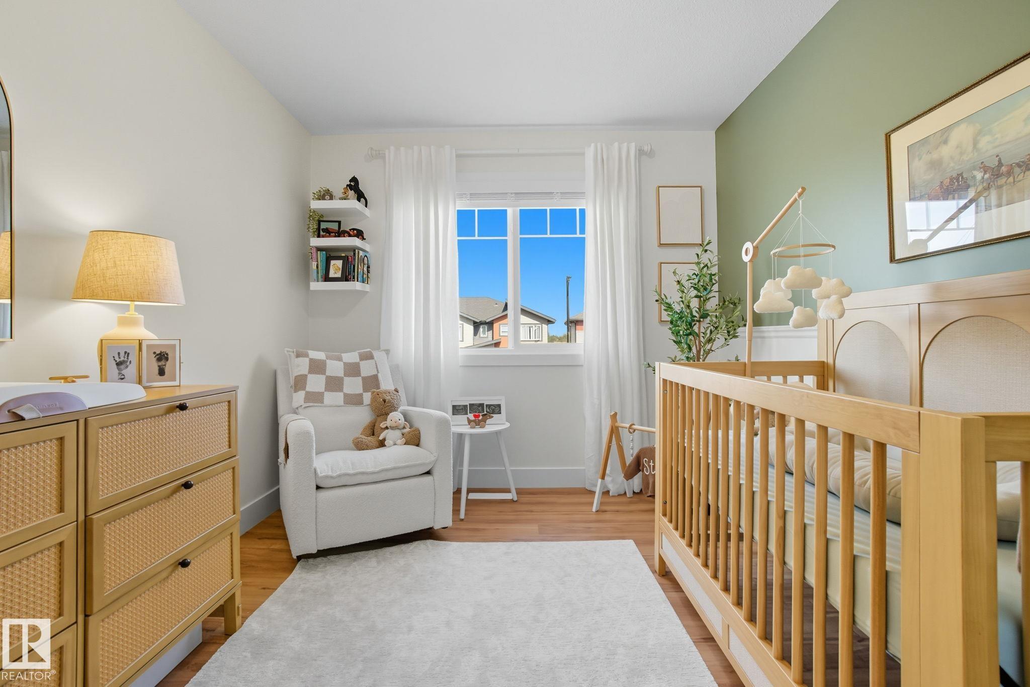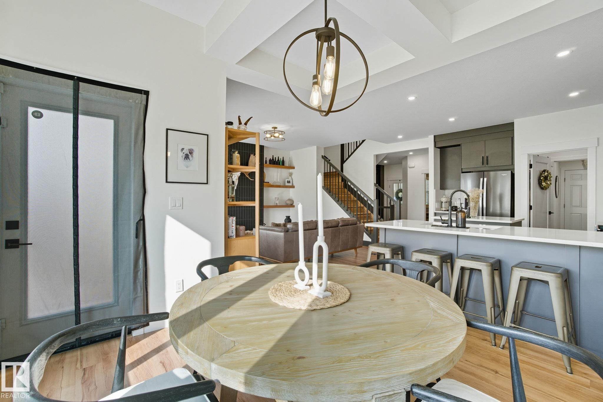 This property truly has it all. Nestled in a family-friendly community, surrounded by scenic walking trails where you can enjoy pond views from your very own balcony! Soaring 9' main floor ceilings, a chic tile fireplace with open display shelving, hard surface flooring throughout the entire home, and gorgeous iron railing create a luxurious feel. Thoughtfully designed mudroom with bench and shelving, seamlessly connects to the gourmet kitchen via walk-through pantry. The kitchen impresses with full height, soft-close cabinetry, gas stove, breakfast bar, and premium countertops & backsplash. Beautiful coffered ceiling creates a stylish dining area that leads to your outdoor oasis complete with BBQ gas line and concrete stamped patio. Enjoy all season comfort with heated garage (22'x19'), A/C, smart thermostat and triple pane windows. This home even has upstairs laundry room + side entrance for possible basement suite! Close to YEG airport and south Edmonton. Welcome to your peaceful retreat!