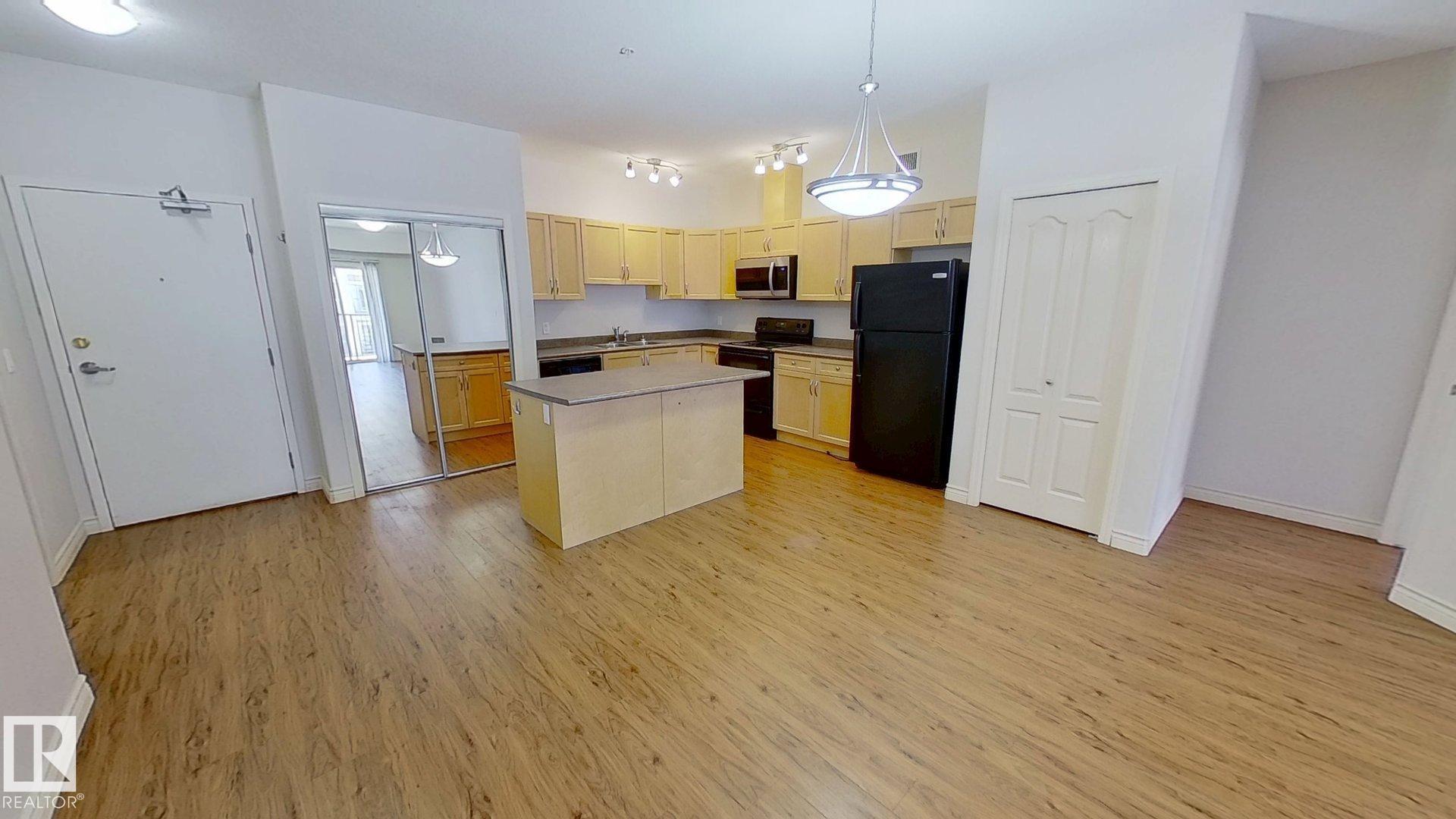 2 bedroom 2 full bathroom condo in Leduc. This unit features a large open concept kitchen with an island, 5 appliances, a large storage room with in-suite laundry, air conditioning and a large patio with gas hookup for BBQ. The master bedroom has a walkthrough his and hers closet with plenty of storage space and opens to a large ensuite with bathtub, shower, vanity, and plenty of counter space. The kitchen is fully equipped with a fridge, stove, microwave, dishwasher, and kitchen island, with a double sink. The building is located just blocks from Leduc Common and has an equipped exercise room, three elevators, security cameras throughout, and ample visitor parking. Water, heat and window treatments are included, along with a secure underground parking stall. No pets.