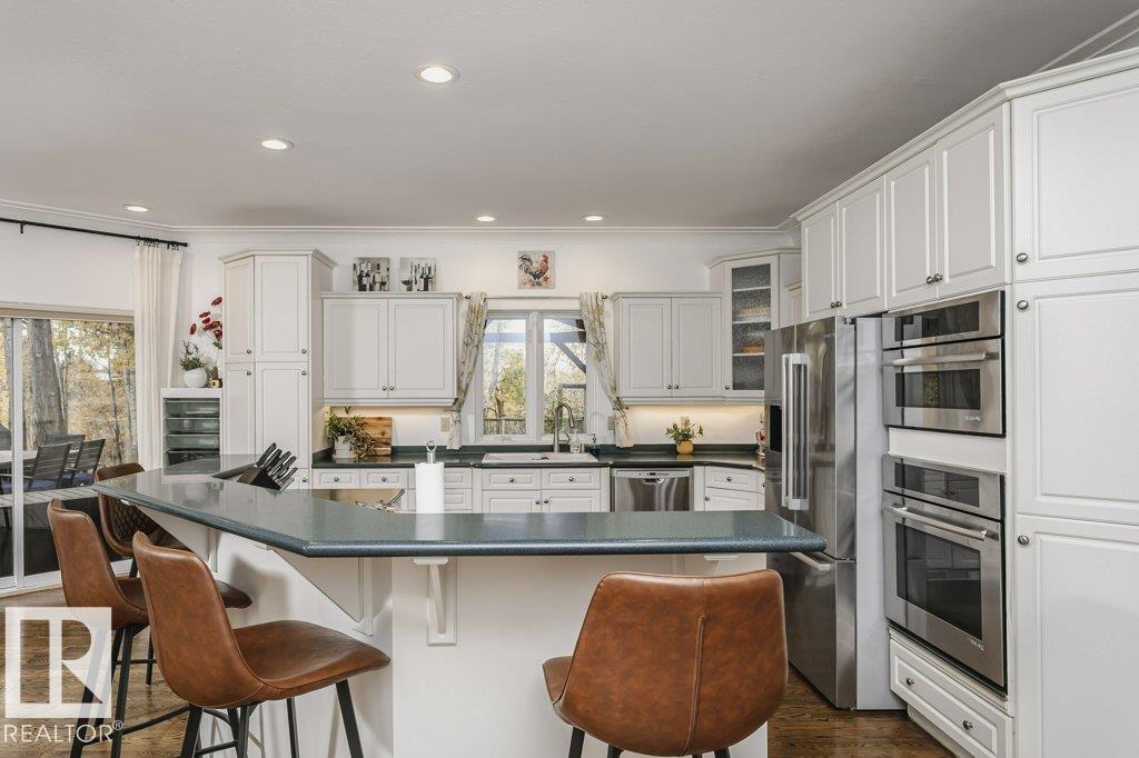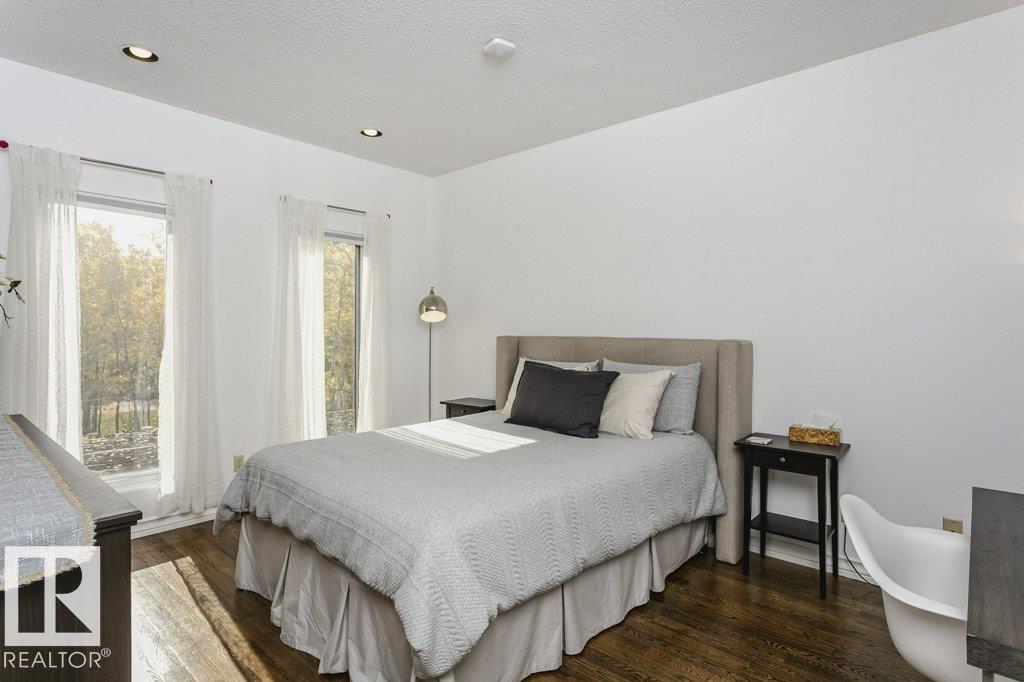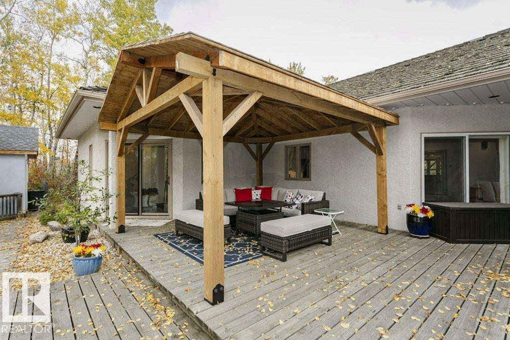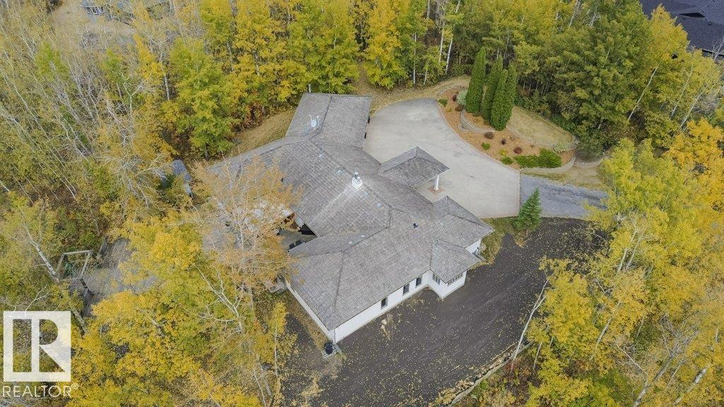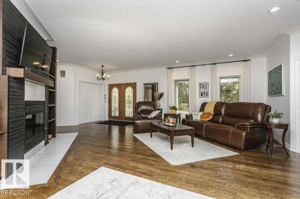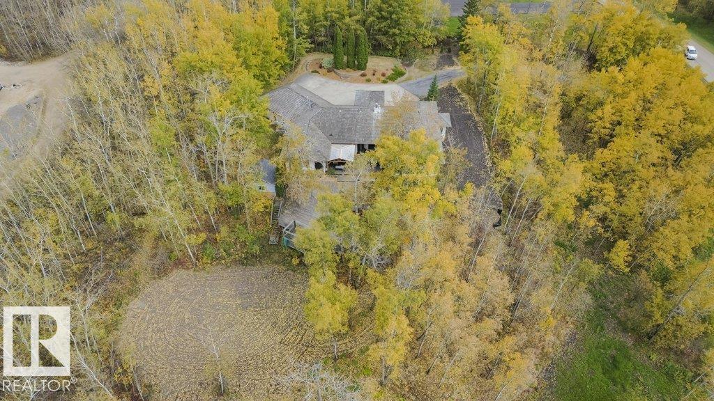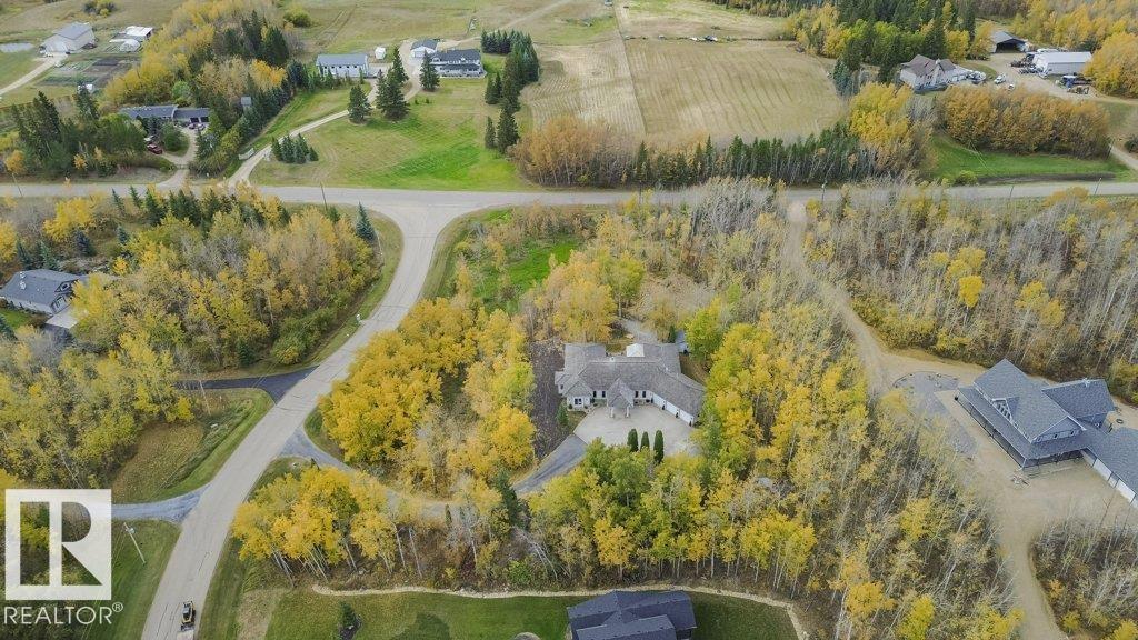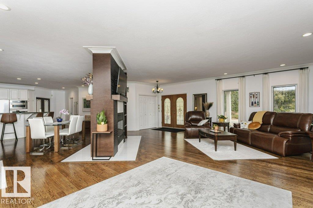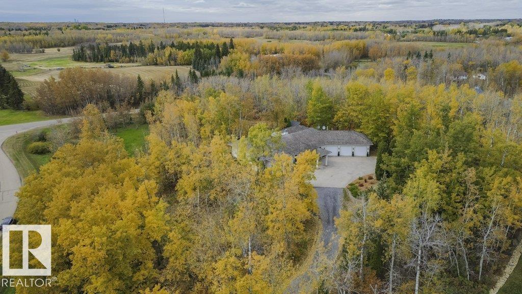 Natural, private setting just minutes from Sherwood Park. Bird watchers delight! This bungalow has an open design with expanses of hardwood flooring and 9 Ft. ceilings throughout. Some of the many upgraded features are the steam shower in the primary bedroom 5 pc. ensuite, with heated tile floor. The primary bedroom is very spacious and also has a walk-in closet. The other 2 bedrooms are on the other end of the house and are large and bright. There's a renovated jack & jill bathroom between them. Enjoy the warmth of a 2-sided fireplace that divides the living room and dining area. The heated triple garage has lots of storage room beside room for 3 full-size vehicles. The deck is massive and includes an area covered by a beautiful gazebo structure. There is are two storage sheds. One has been used as a playhouse. The crawl space foundation is over 5 ft. in height with a concrete floor. No shortage of storage spaces in this lovely home.