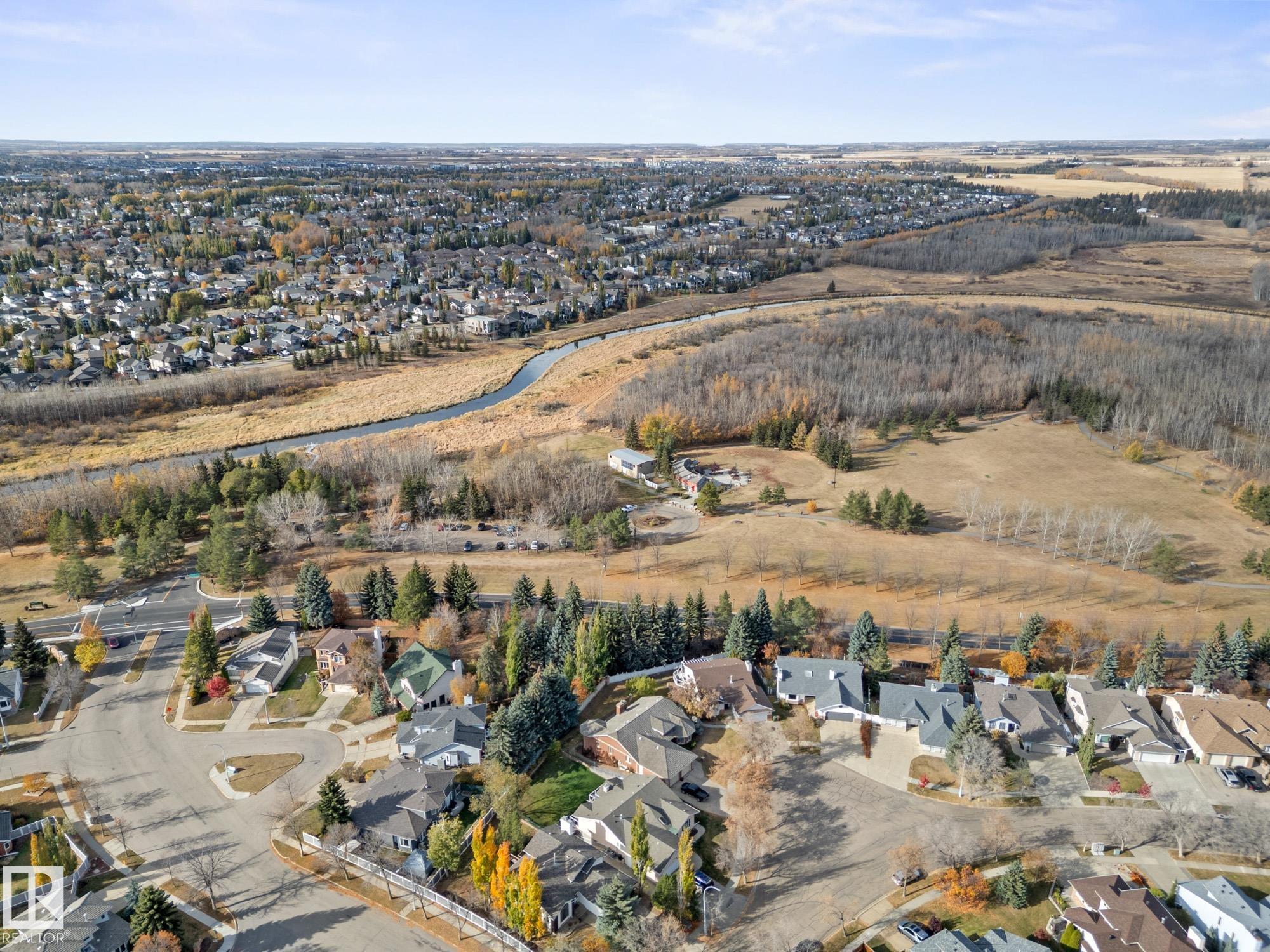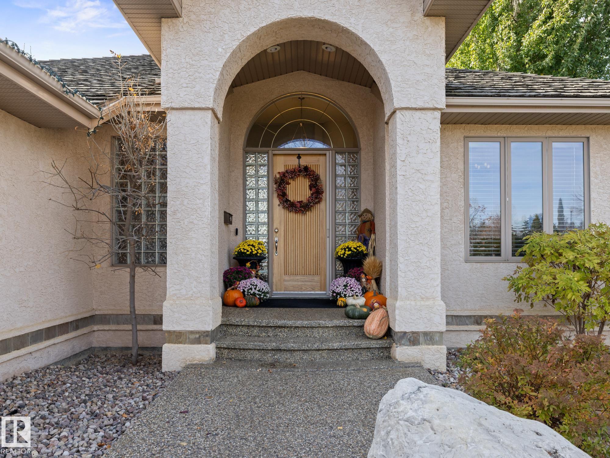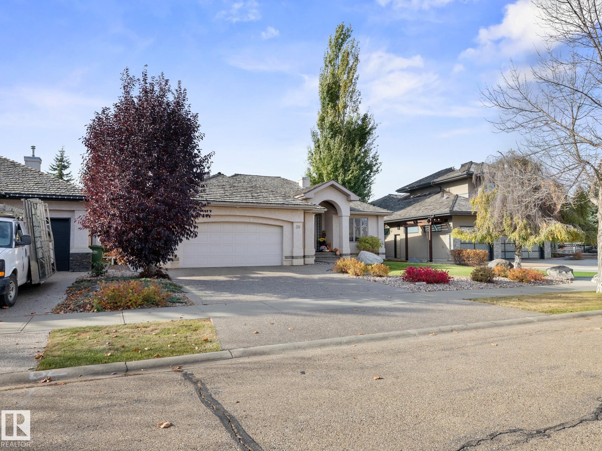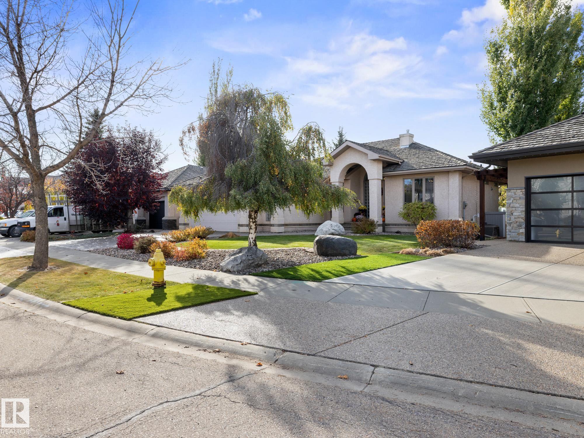LOVELY FORMER SHOWHOME. This executive bungalow is located on one of St. Albert's most prestigious crescents with view of nature in back. Highly coveted location. 1750 sq. ft. on main floor with a fully developed walkout basement in total 3400 sq. ft. Your family will love this elegant home built by Design Innovations. Main floor has an open concept with kitchen overlooking living room and large eating nook. Warm oak cabinets with granite counter tops, large island, and walk-in pantry. Vaulted ceilings. Entertain in style with this large formal dining room. Primary bedroom is large with beautiful ensuite. Natural light throughout home. IN FLOOR HEATING on main flr tile. WALKOUT basement w. family room, 4 piece bathroom, and two large bedrooms and IN FLOOR HEATING. A/C ('14), Newer Furnace and 1 h.w. tank is newer ('20), Fresh Paint. Gorgeous landscaping complete with paving stones and flowers. Enjoy the view of nature from your main floor. Walk to RiverLot 56 for X-skiing, Botanical Gardens, Golf.