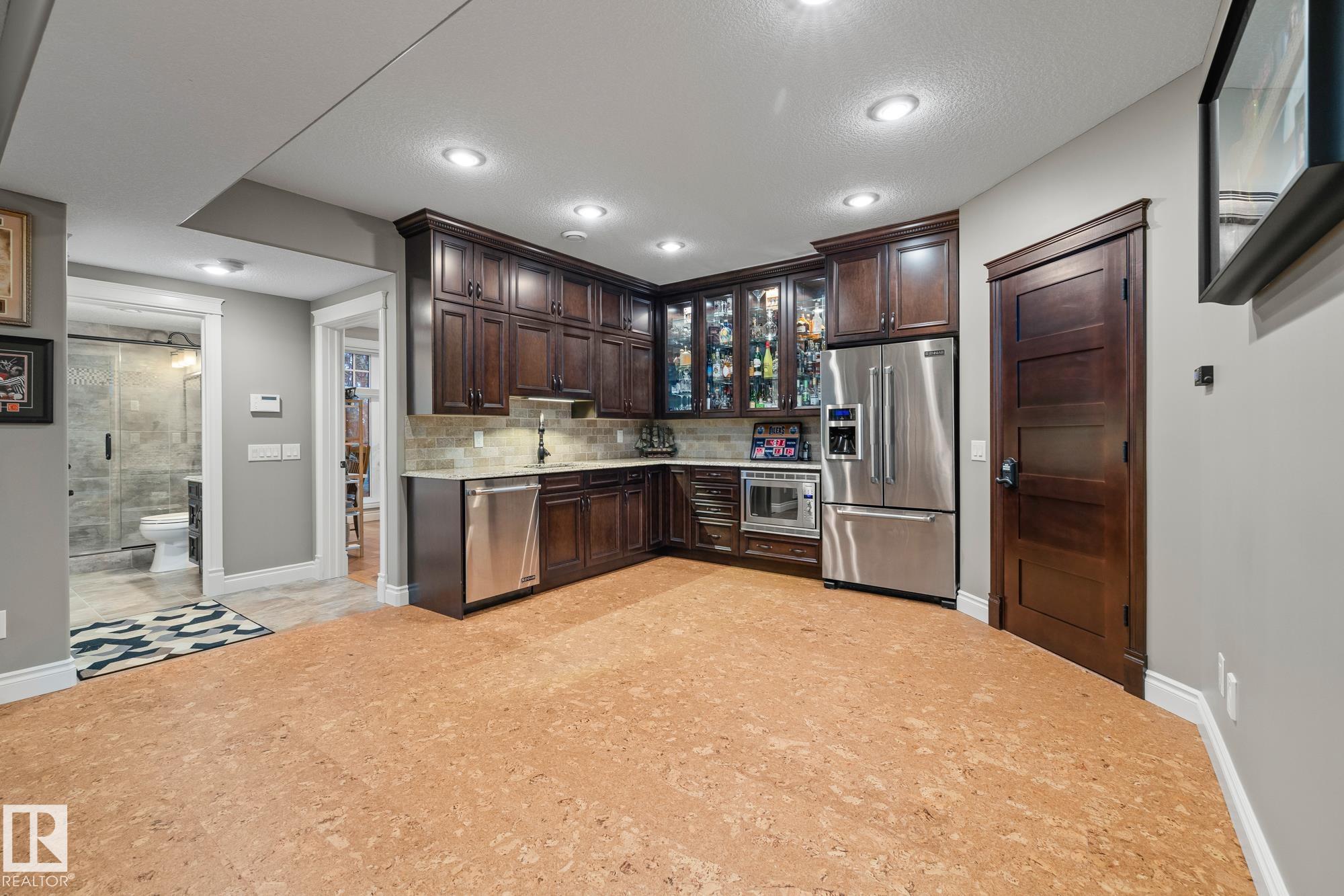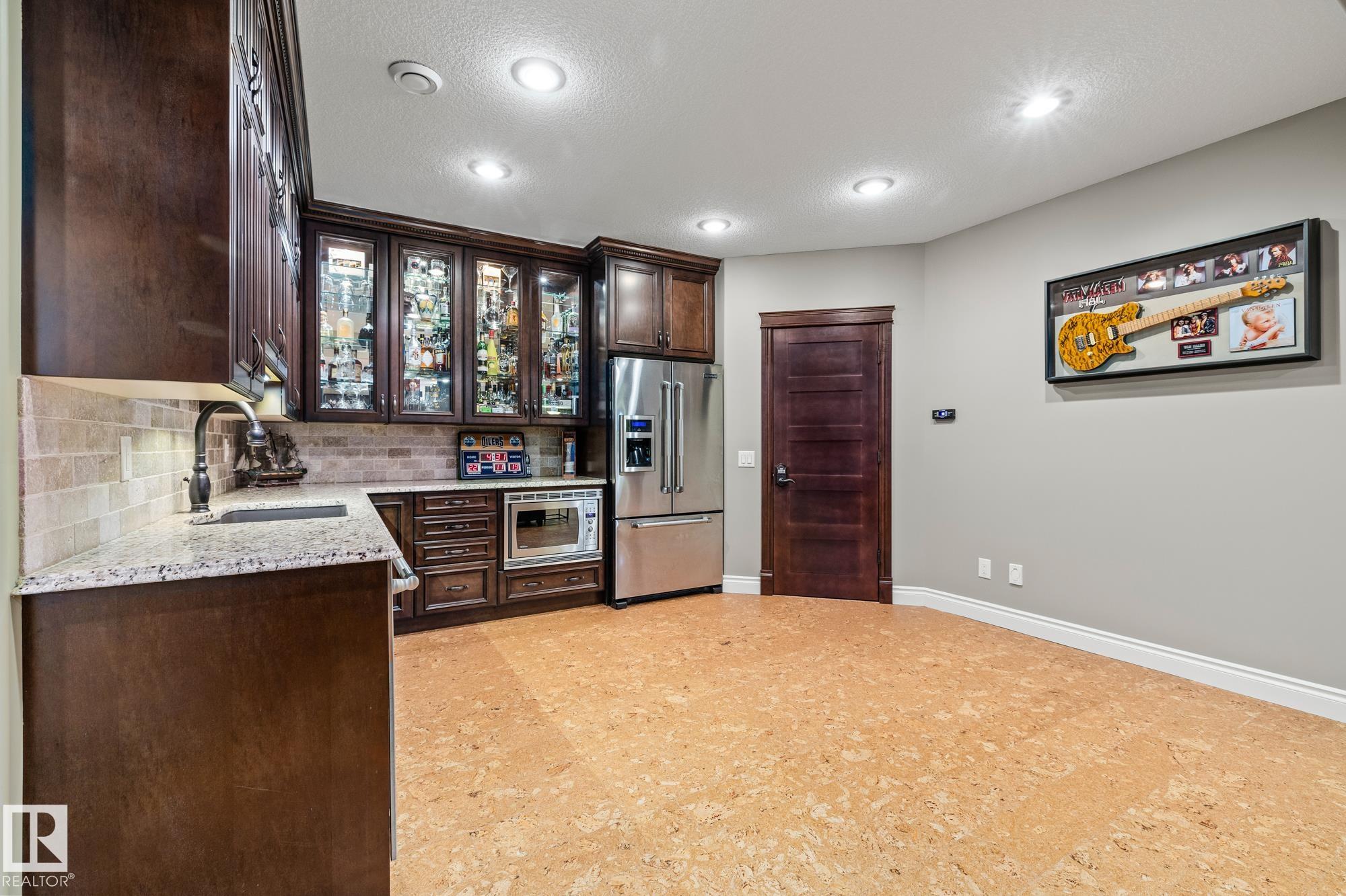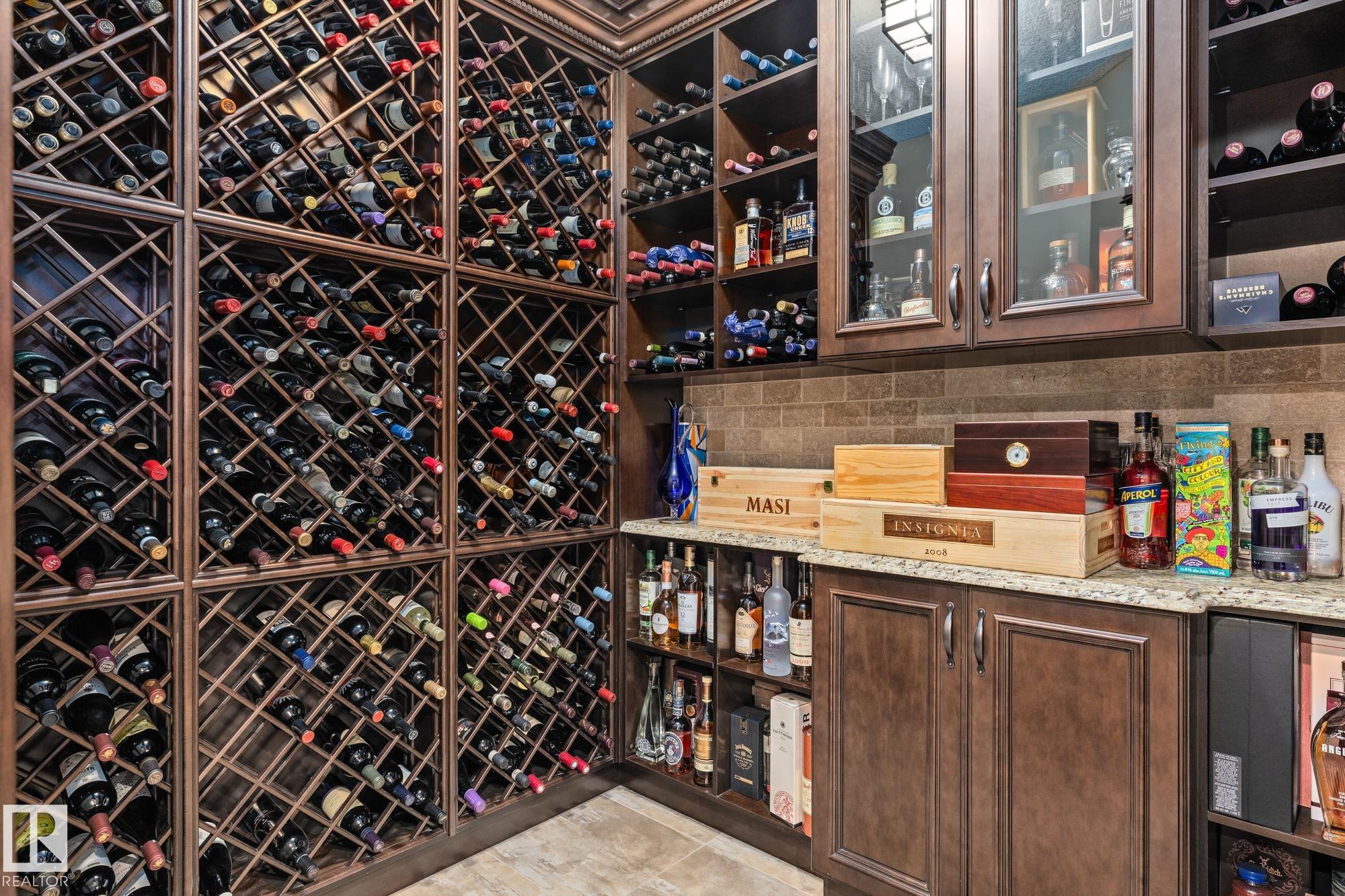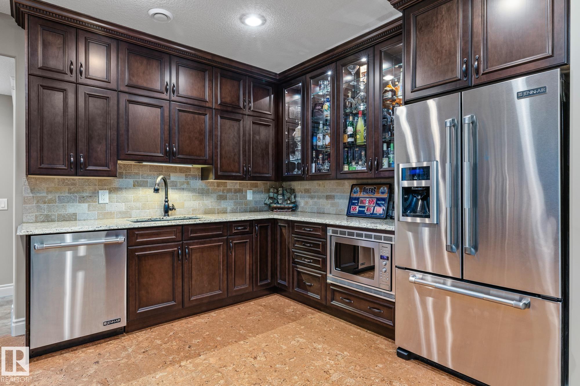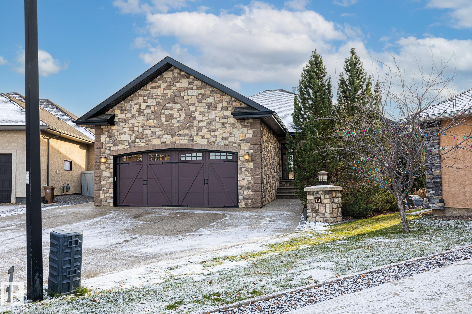 Experience unmatched luxury in this executive custom-built walkout bungalow in Kingswood. With over 4,440 sq ft of living space, this home offers 10 ft ceilings, travertine tile, scraped hardwood, coffered detailing and a full stone fireplace that anchors the main living area. The chef's kitchen features JennAir appliances, granite counters, a huge island, custom cabinetry, walk-through pantry that leads to an oversized mudroom with custom lockers and den on the main. The private primary suite includes a large walk-in closet and a spa-inspired ensuite with heated floors, dual sinks, jetted tub and a walk-in double steam shower. The walkout basement is built for entertaining with heated floors, wet bar, 4 large bedrooms, two full baths, a spacious laundry room and a temperature-controlled walk-in wine cellar. Outside, enjoy a low maintenance landscaped yard with privacy trees, stone patio, composite deck. A heated oversized garage with a lift accommodates 3 indoor stalls. An exceptional Kingswood home.